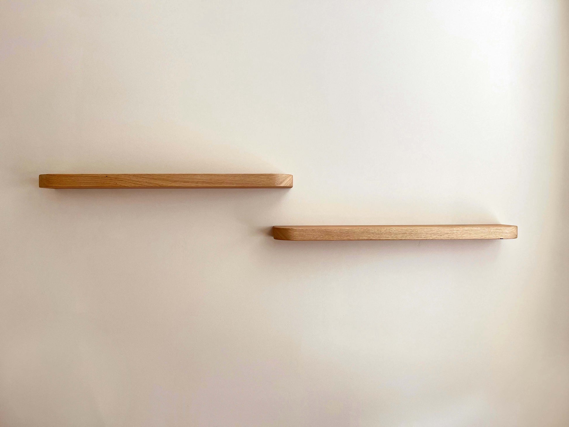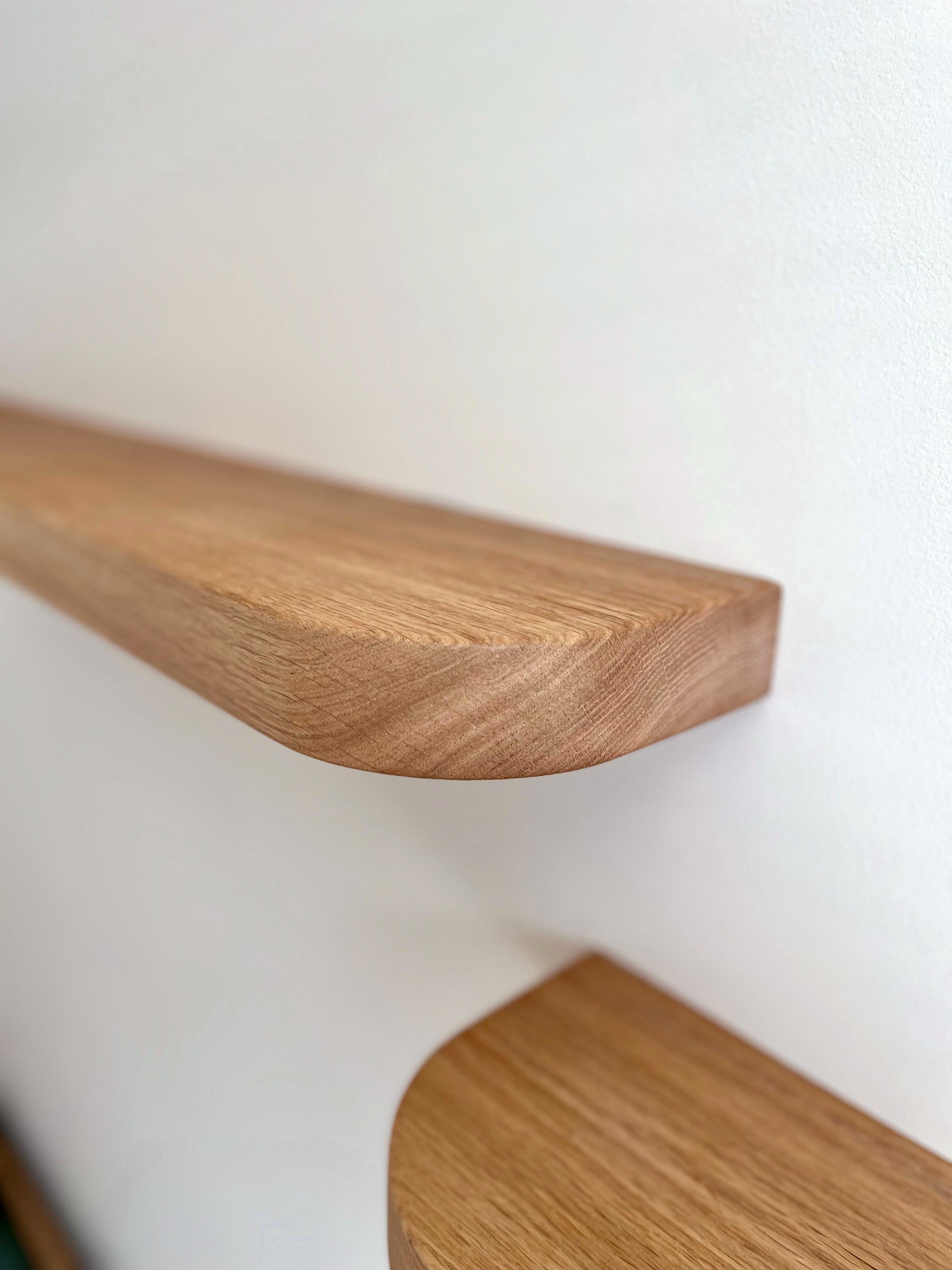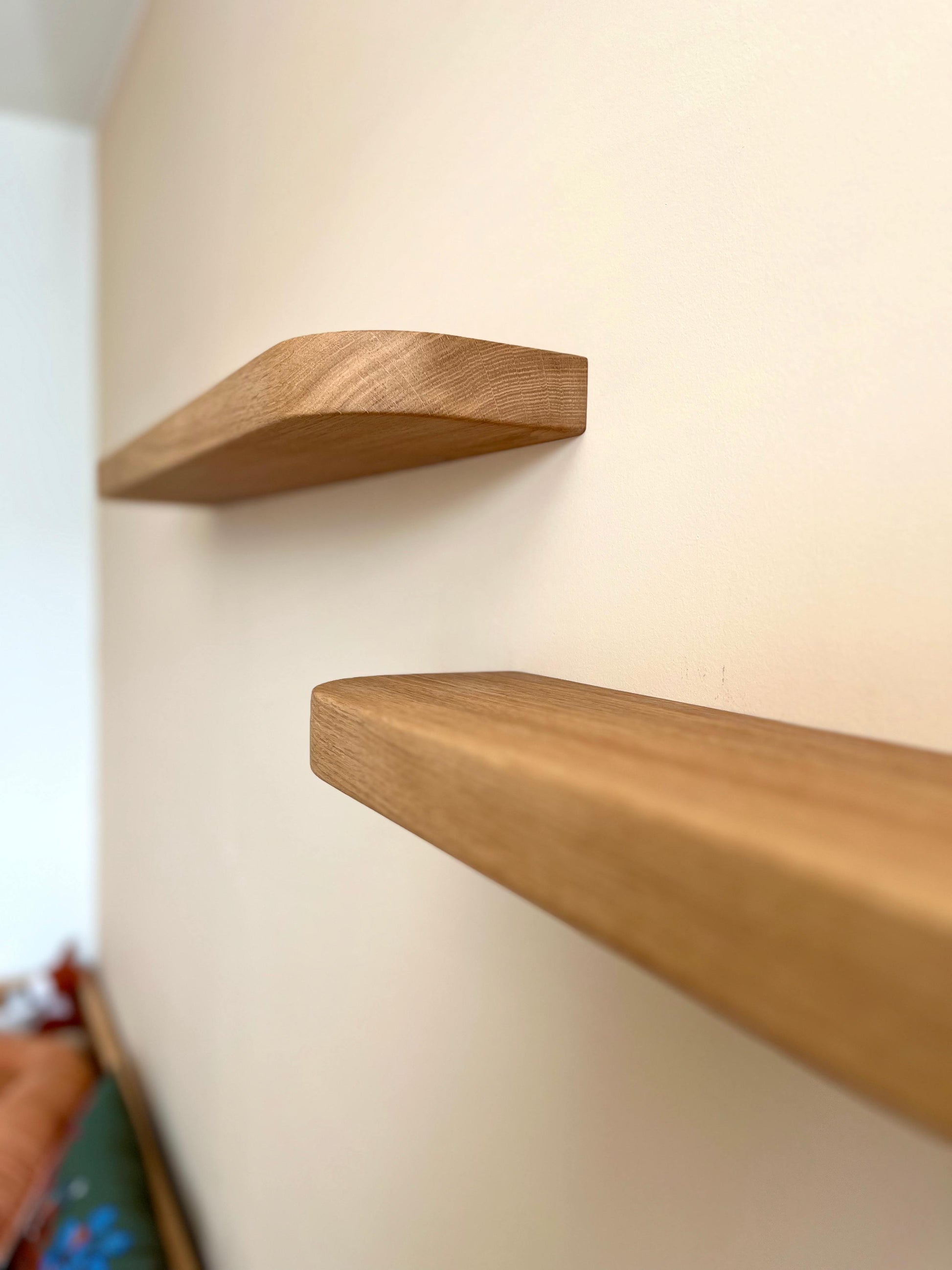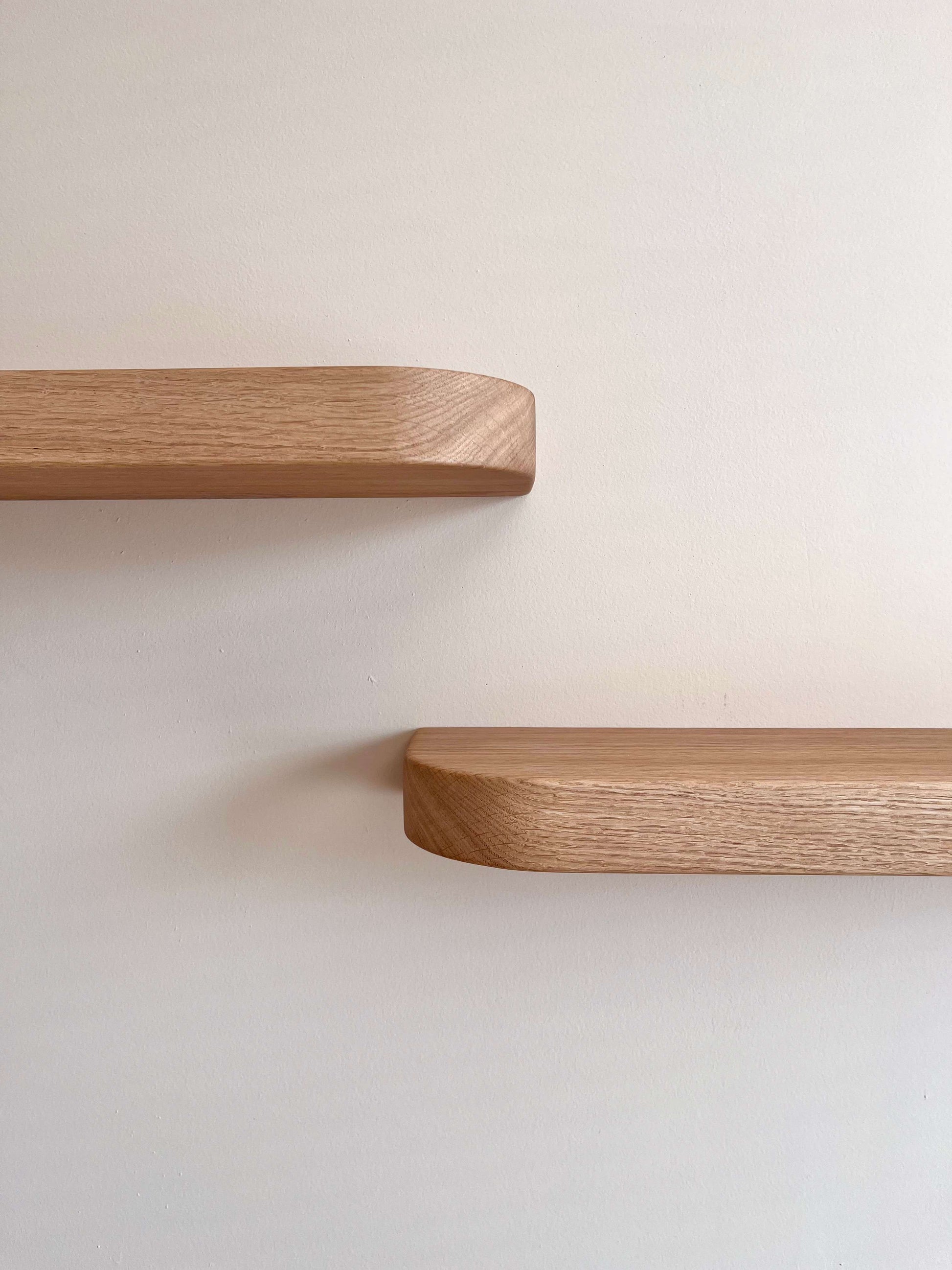 Op verzoek is deze set van twee zwevende eikenhouten wandplanken gemaakt. De wandplanken zijn gemaakt van Europees eiken en hebben afgeronde hoeken en zacht afgeronde randen voor een speels uiterlijk. De planken zijn afgewerkt met twee lagen van een kleurloze, matte Osmo Hardwaxolie. Dit geeft de planken een mooie natuurlijke kleur.