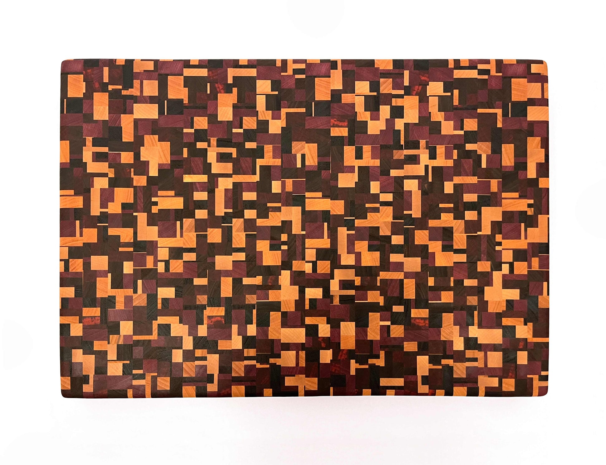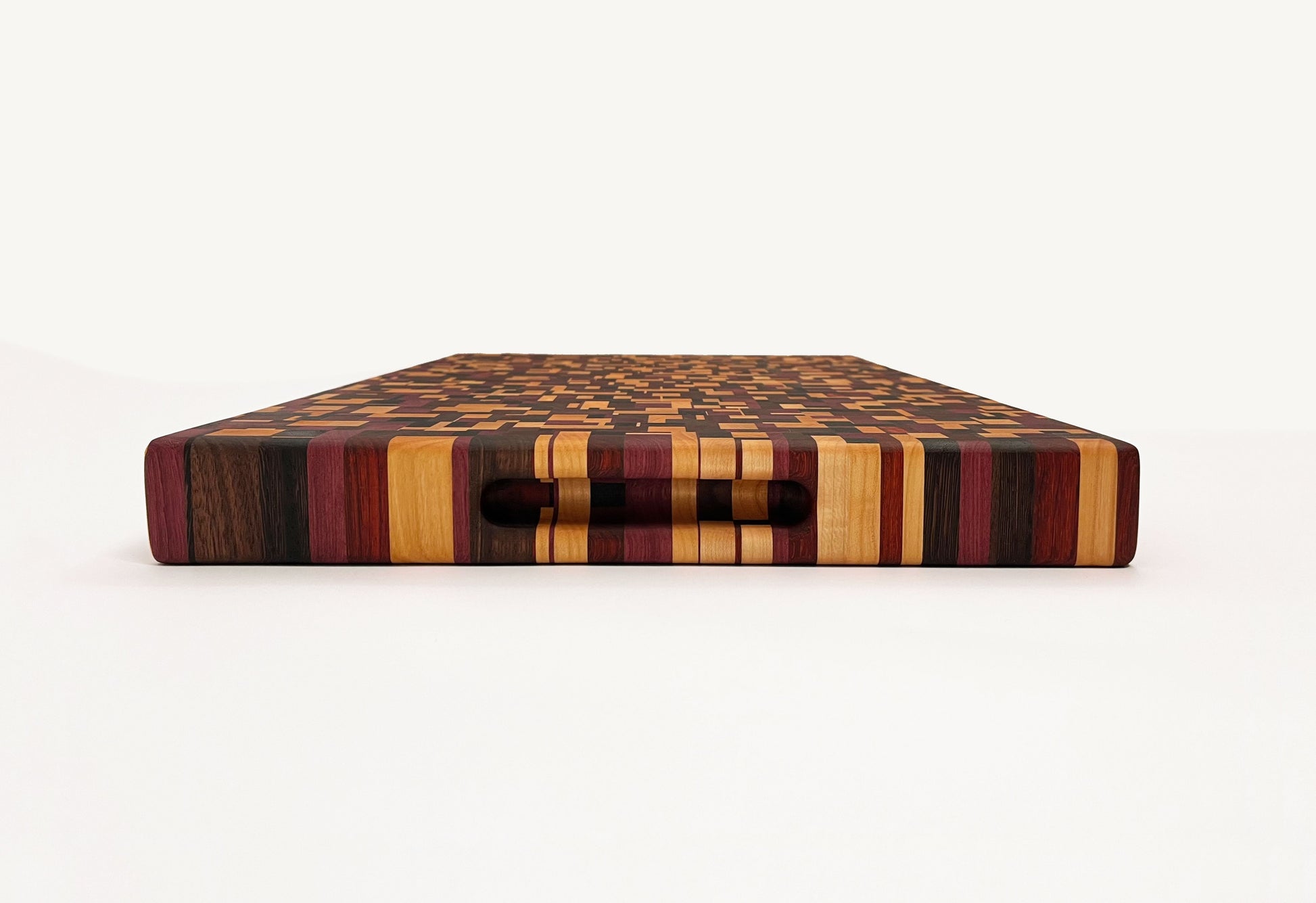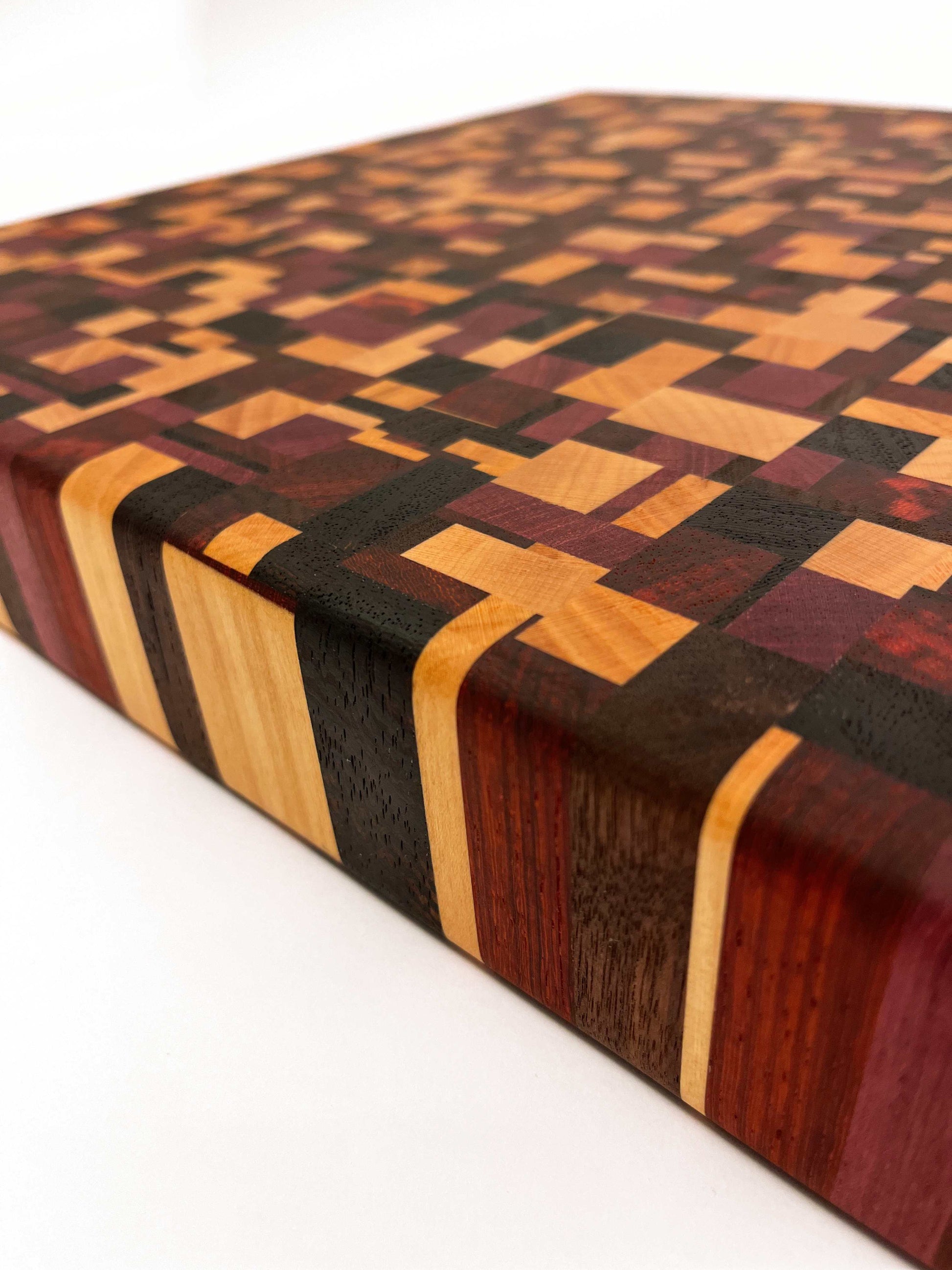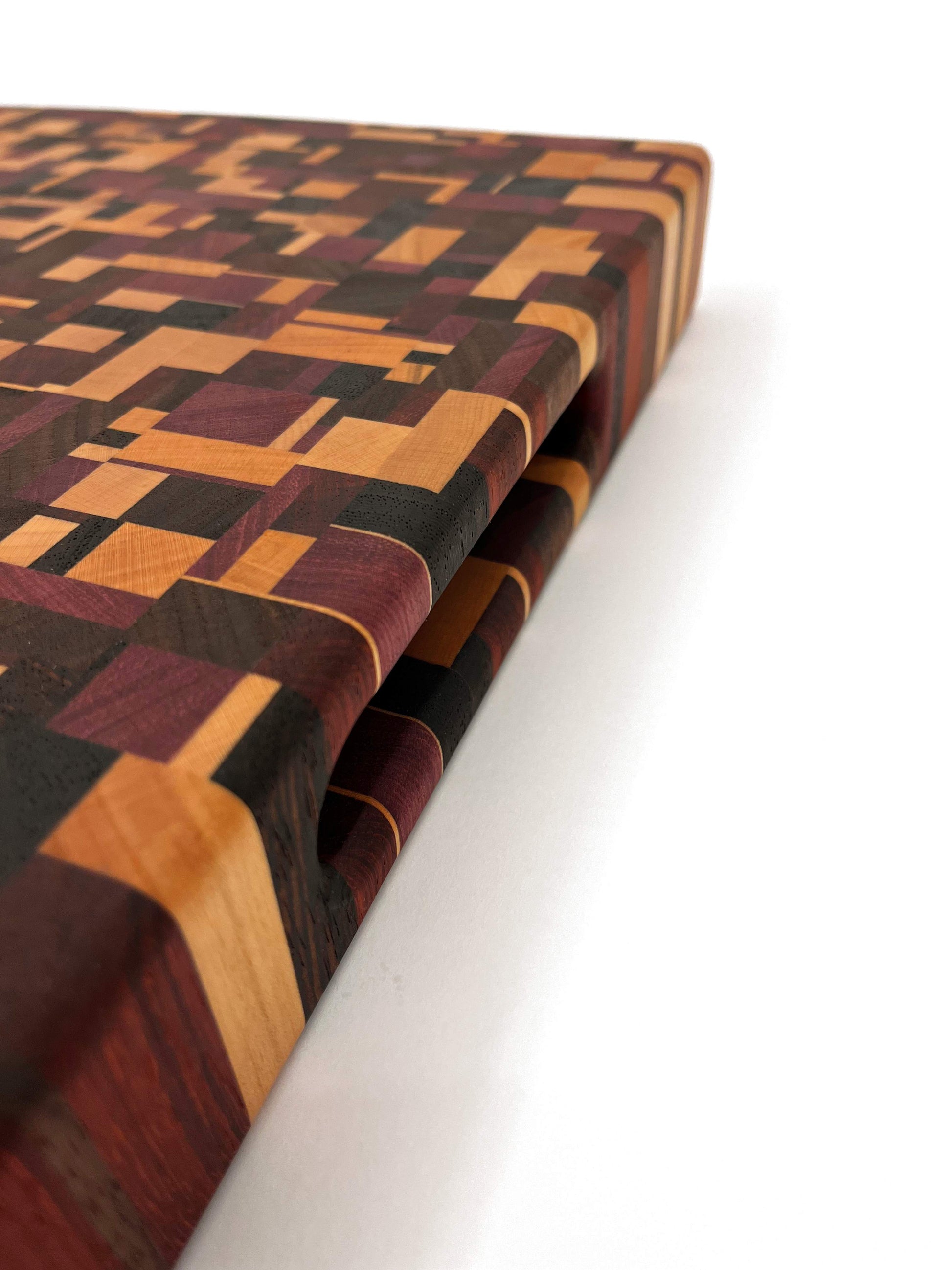 Deze kopshouten snijplank met chaotisch patroon is een werkelijk bijzonder stuk. De snijplank is gemaakt van zes soorten hout: Europees kersen, Amerikaans esdoorn, Amerikaans noten, Zuid-Amerikaans purperhart, padoek en wengé, beide afkomstig uit de zuidkust van Kameroen. Het noten en wengé is donker gekleurd, het kersen en esdoorn is licht gekleurd, het purperhart is vol paars gekleurd en het padoek is vurig donkerrood. Een erg mooie combinatie van houtsoorten, die de snijplank een uniek kleurenpalet geeft.