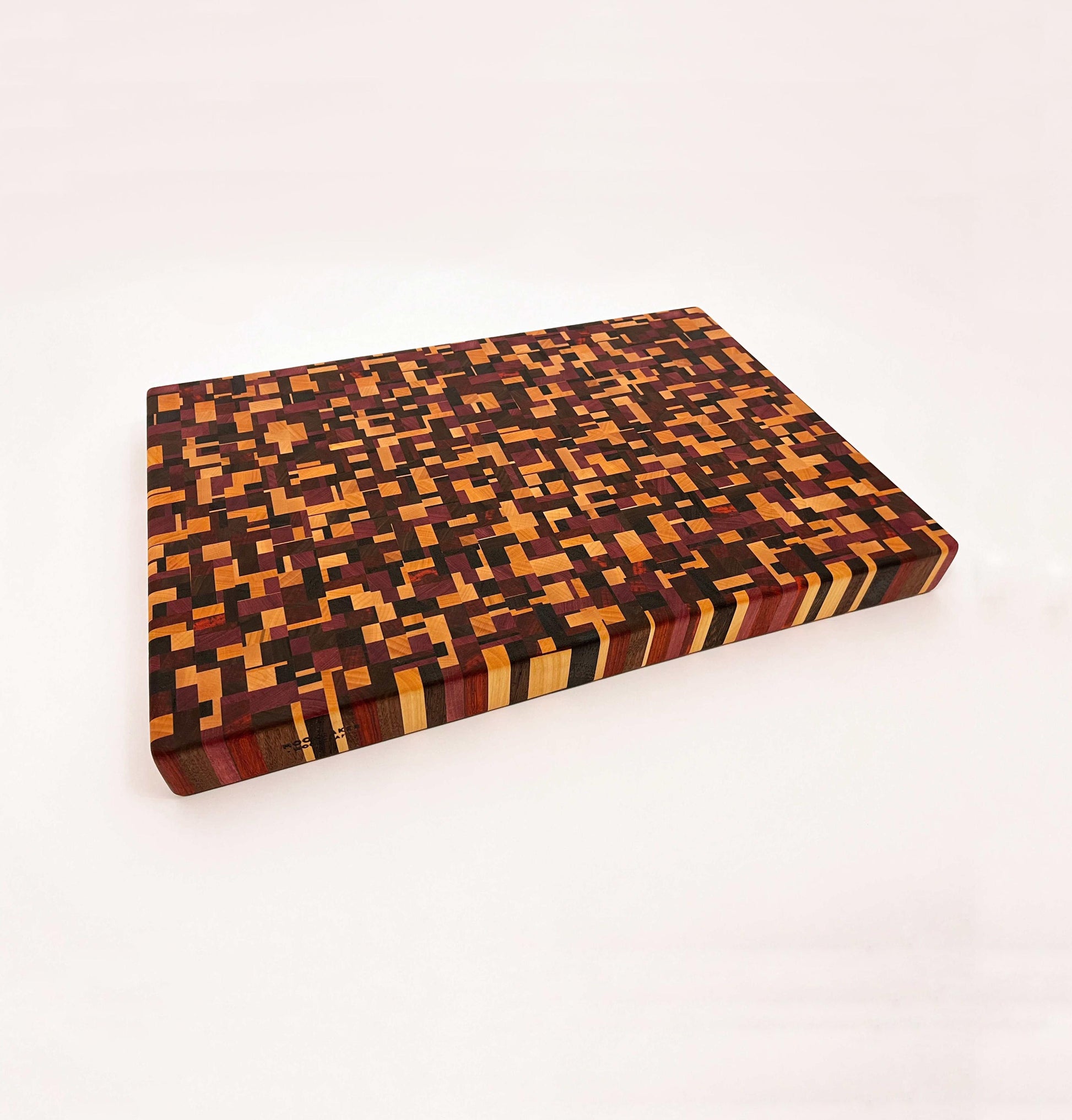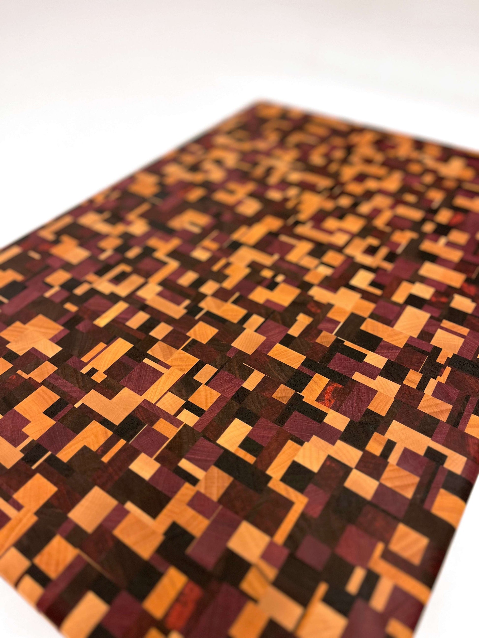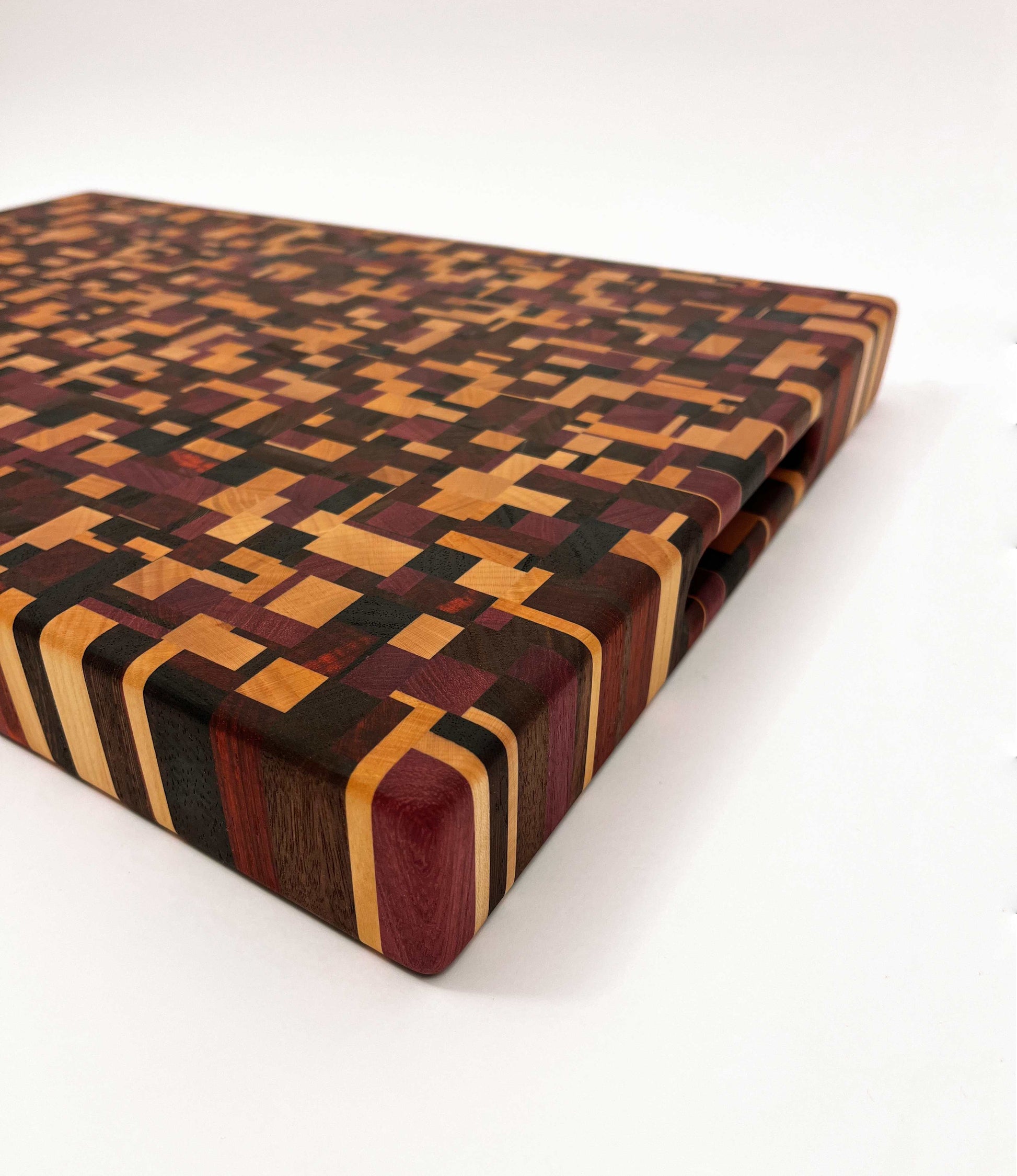 Deze kopshouten snijplank met chaotisch patroon is een werkelijk bijzonder stuk. De snijplank is gemaakt van zes soorten hout: Europees kersen, Amerikaans esdoorn, Amerikaans noten, Zuid-Amerikaans purperhart, padoek en wengé, beide afkomstig uit de zuidkust van Kameroen. Het noten en wengé is donker gekleurd, het kersen en esdoorn is licht gekleurd, het purperhart is vol paars gekleurd en het padoek is vurig donkerrood. Een erg mooie combinatie van houtsoorten, die de snijplank een uniek kleurenpalet geeft.