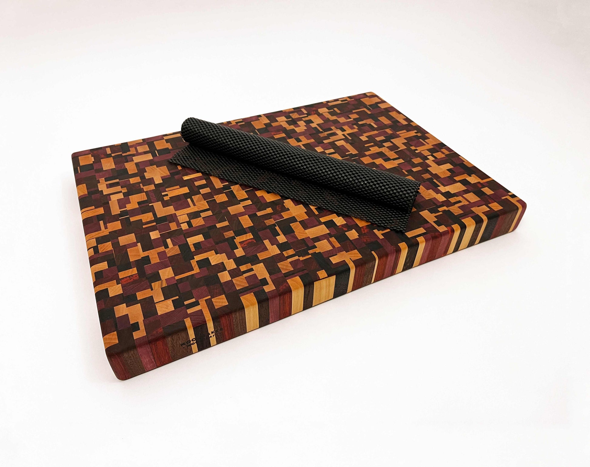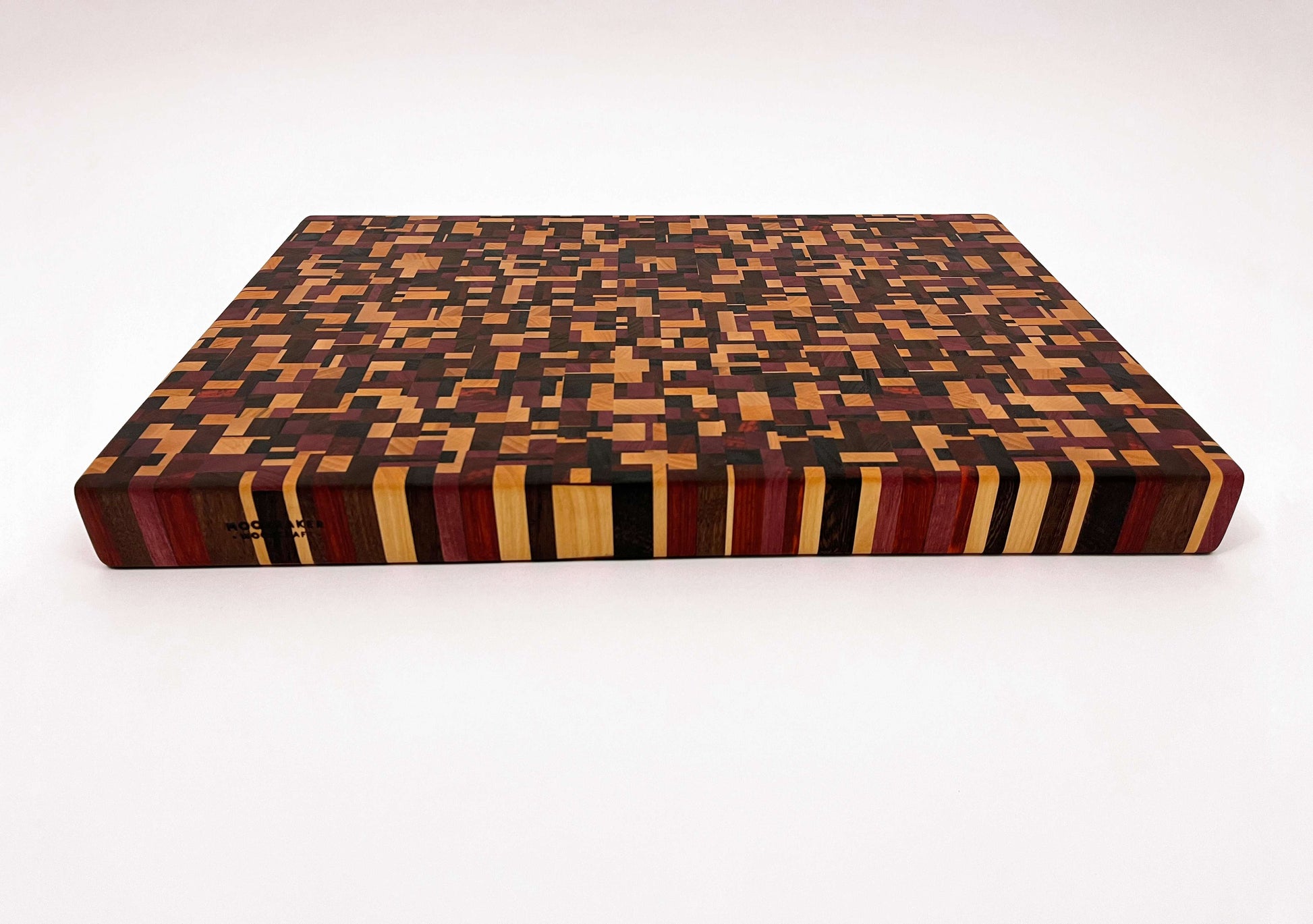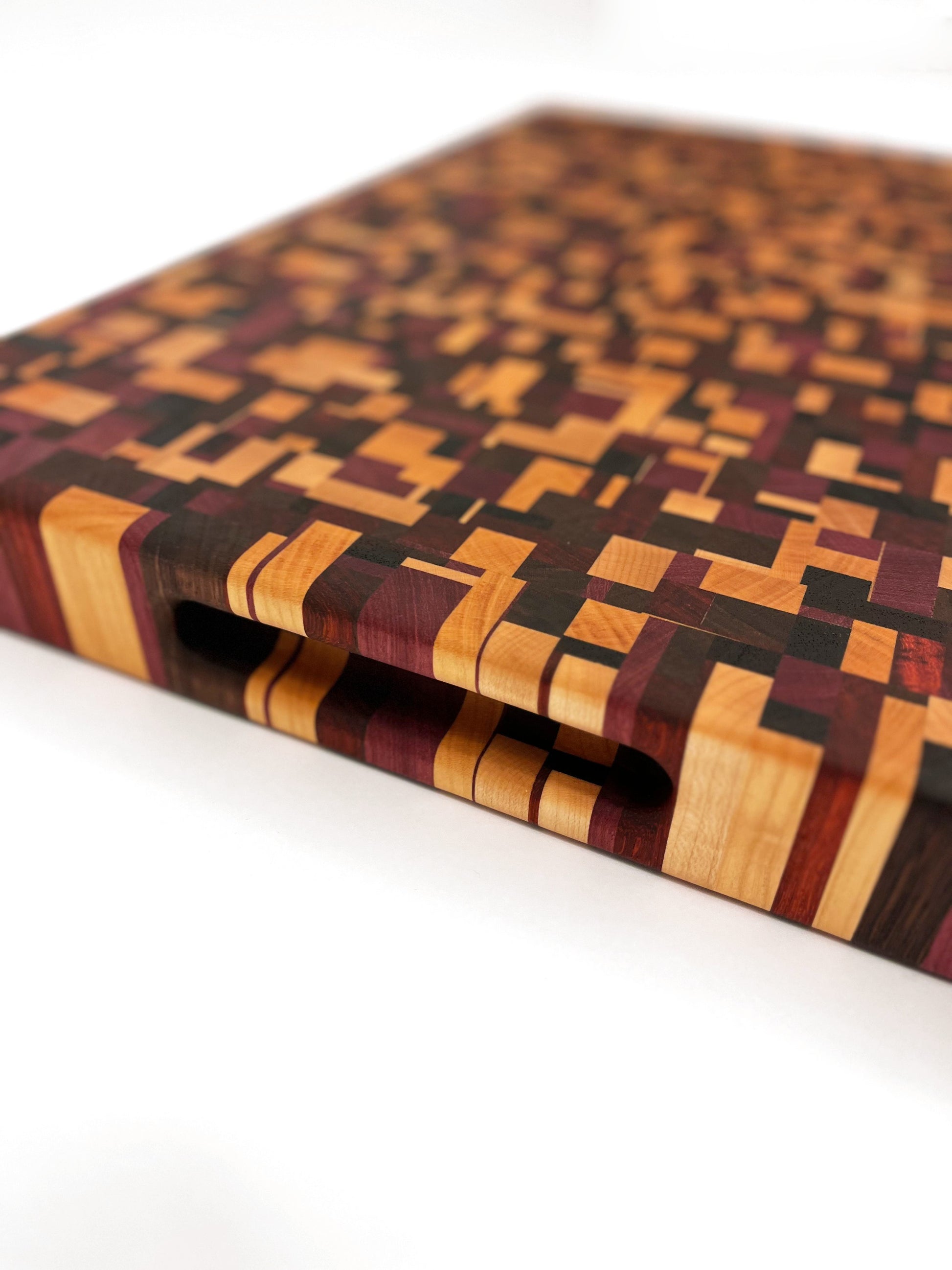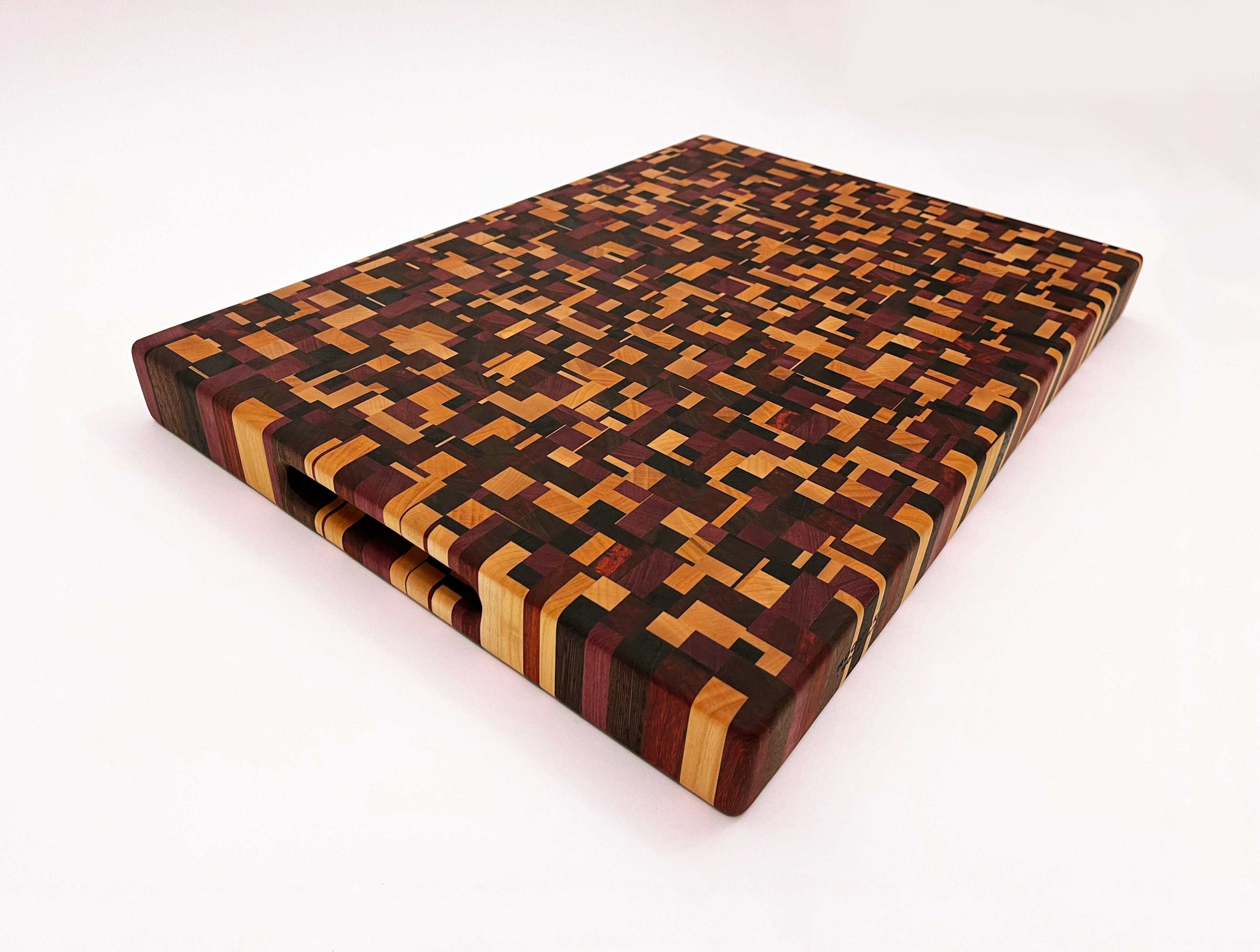 Deze kopshouten snijplank met chaotisch patroon is een werkelijk bijzonder stuk. De snijplank is gemaakt van zes soorten hout: Europees kersen, Amerikaans esdoorn, Amerikaans noten, Zuid-Amerikaans purperhart, padoek en wengé, beide afkomstig uit de zuidkust van Kameroen. Het noten en wengé is donker gekleurd, het kersen en esdoorn is licht gekleurd, het purperhart is vol paars gekleurd en het padoek is vurig donkerrood. Een erg mooie combinatie van houtsoorten, die de snijplank een uniek kleurenpalet geeft.